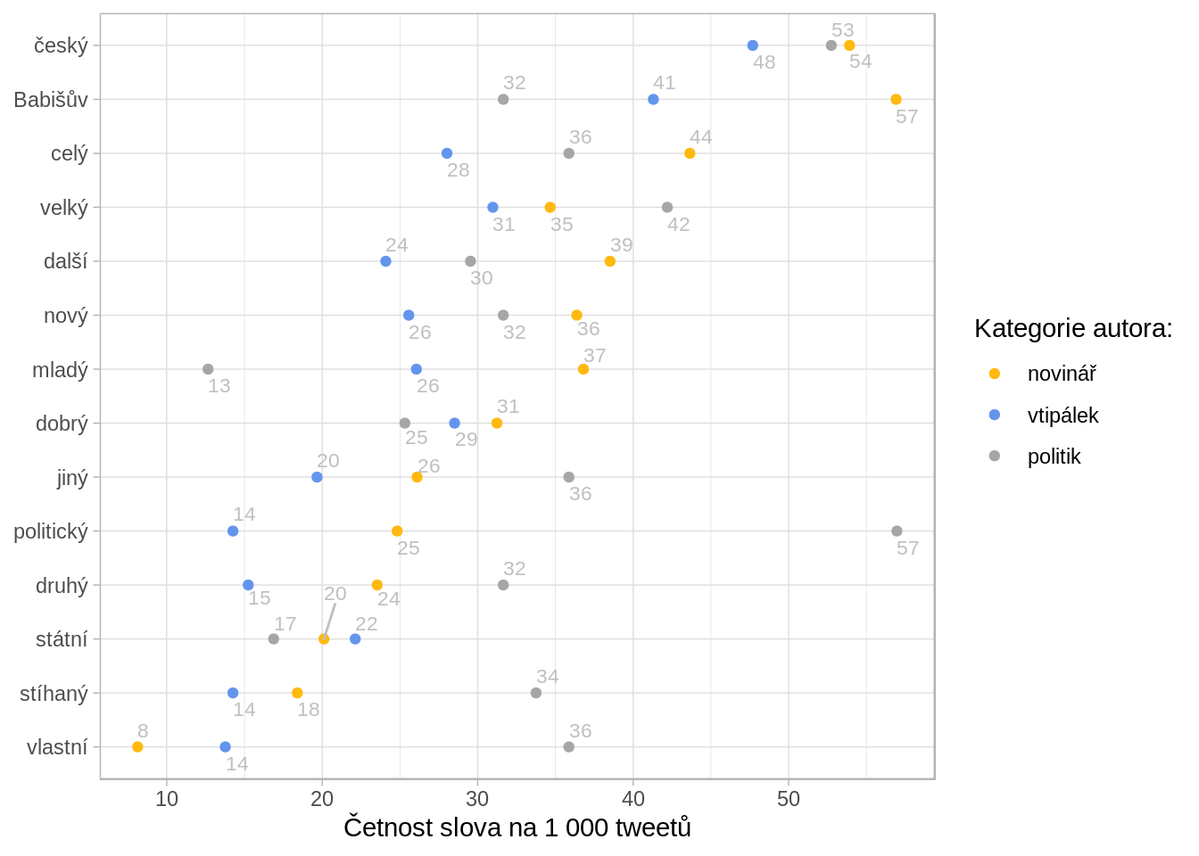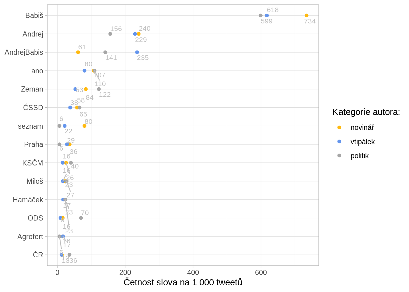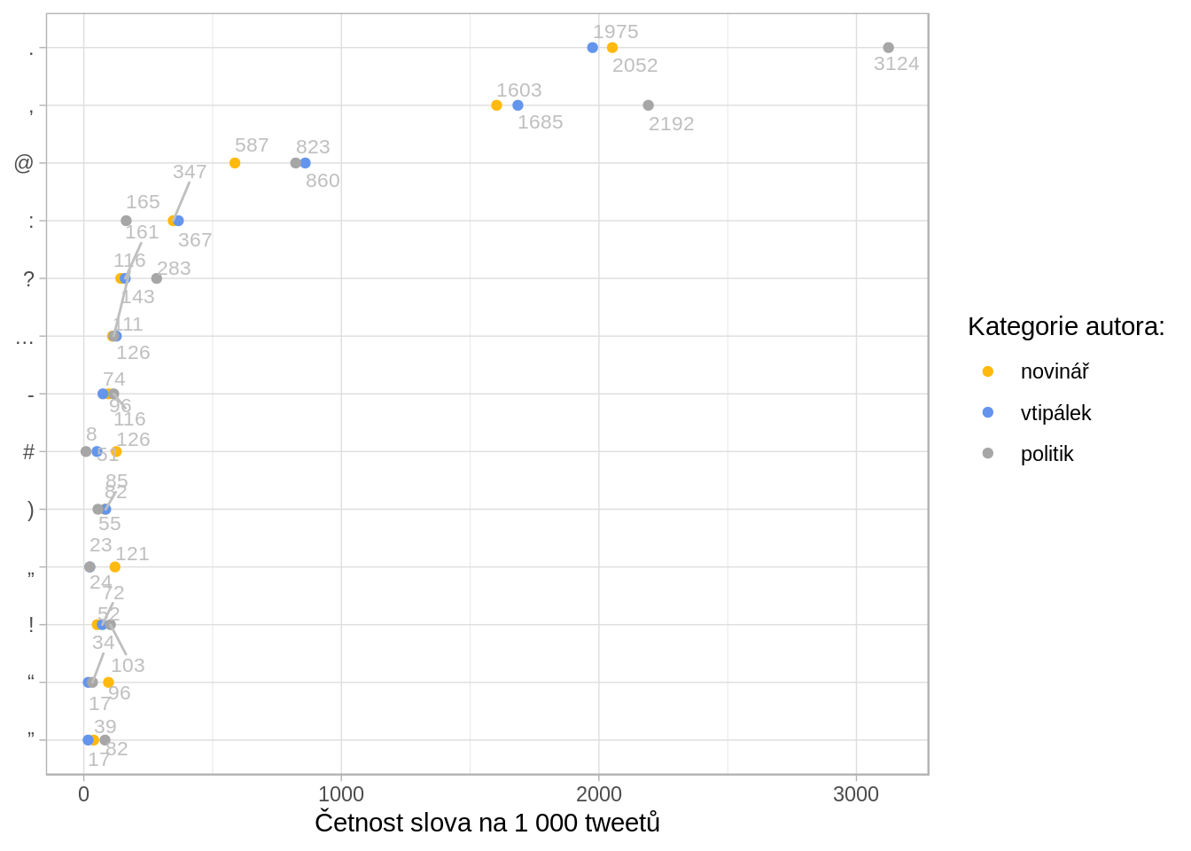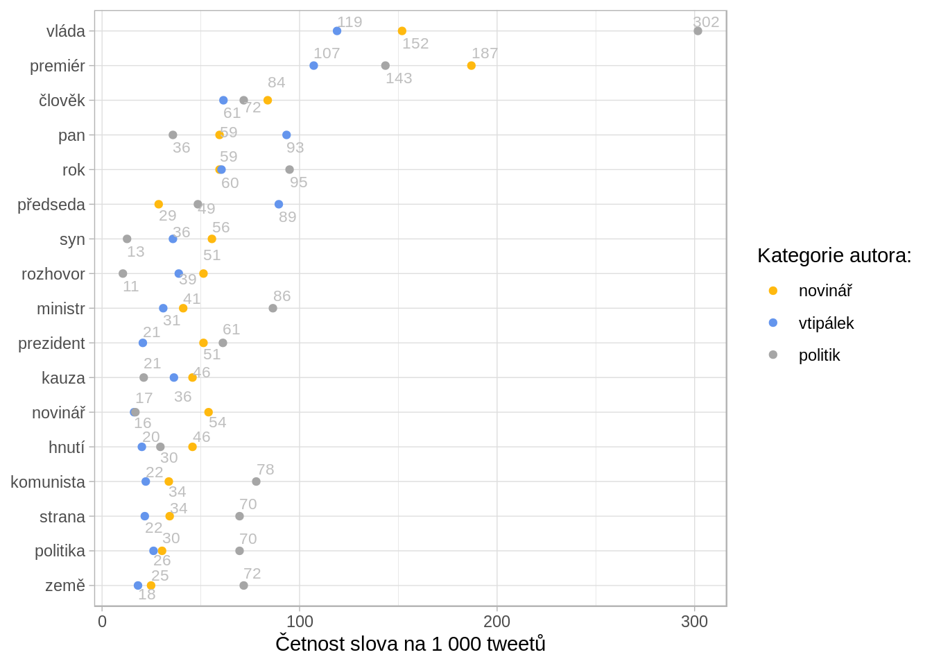 Tyto tři skupiny netweetují stejně často, a tak nebylo praktické srovnávat absolutní počty slov. Srovnávám proto počty relativní - počet použití slova na 1 000 tweetů.