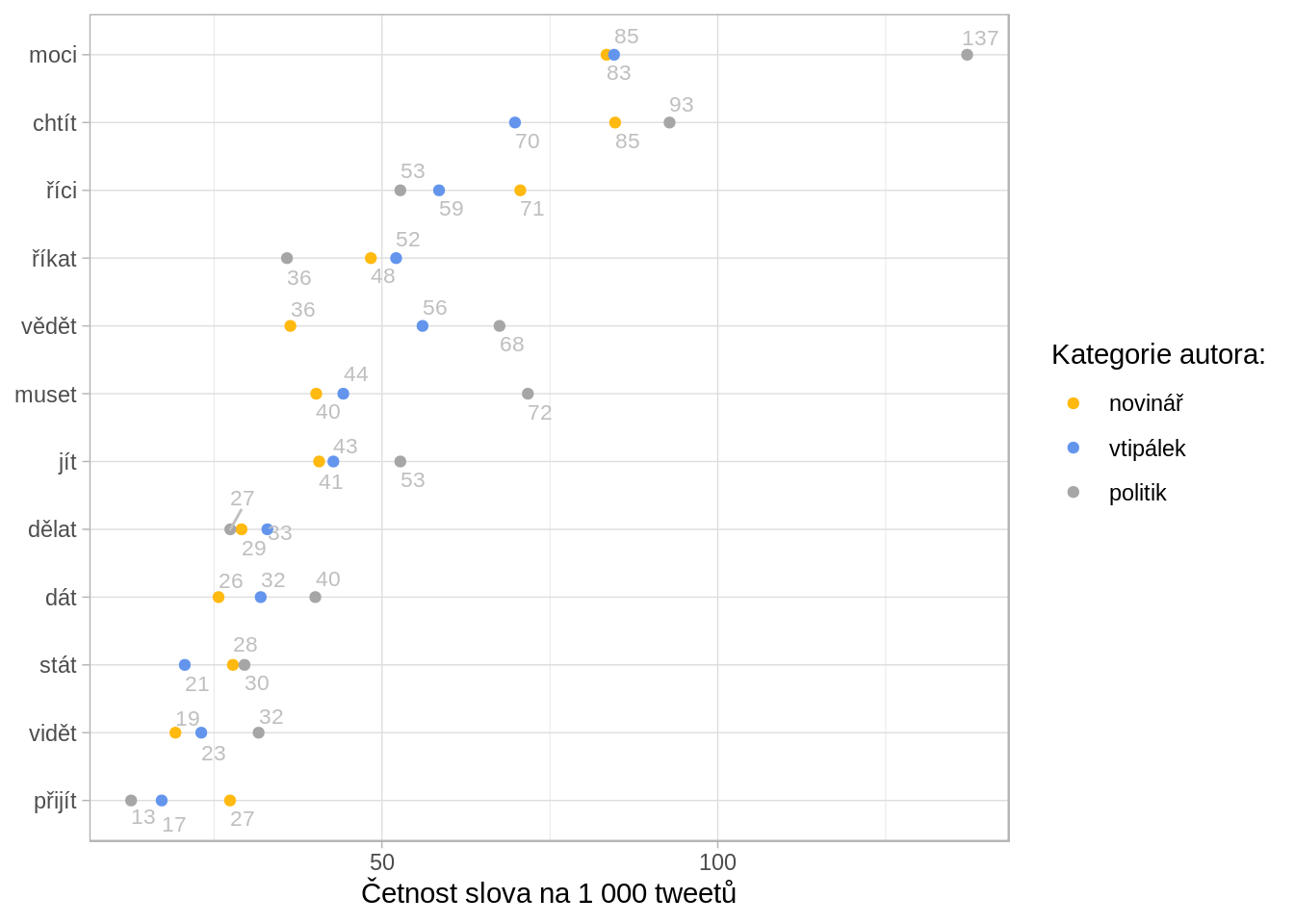 Ze sloves jsem pro lepší čitelnost grafů musel vyloučit “být” a “mít” - protože fakt, že Andrej Babiš je či byl toto či ono, případně že má či by měl udělat toto či ono, se opakují tak často, že ostatním slovesům ničí osy.
