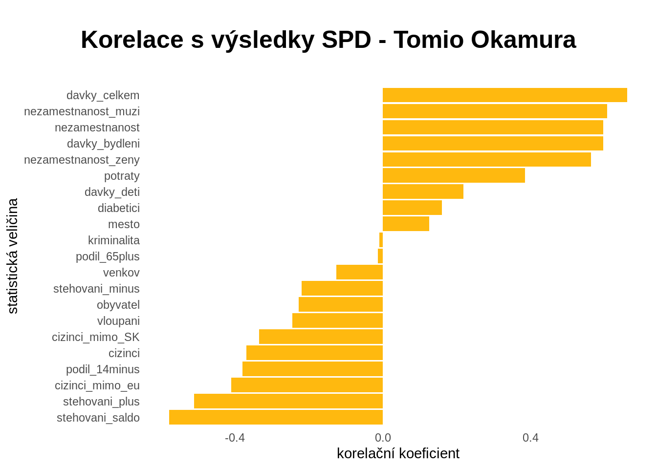 Když jsem nepotvrdil migraci jako spouštěč podpory SPD tak jsem se rozhodl prozkoumat korelaci podpory SPD s co největším počtem veličin, abych našel tu nejsilnější. Protože ne všechny veličiny byly dostupné na úroveň trojkové obce musel jsem pracovat na úrovni okresu.
