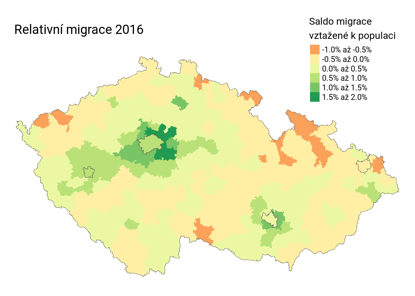 Pro otestování této hypotézy jsem sestavil druhou mapu, která pro trojkové obce ukazuje relativní migraci (saldo migrace vztažené k počtu obyvatel) za rok 2016.