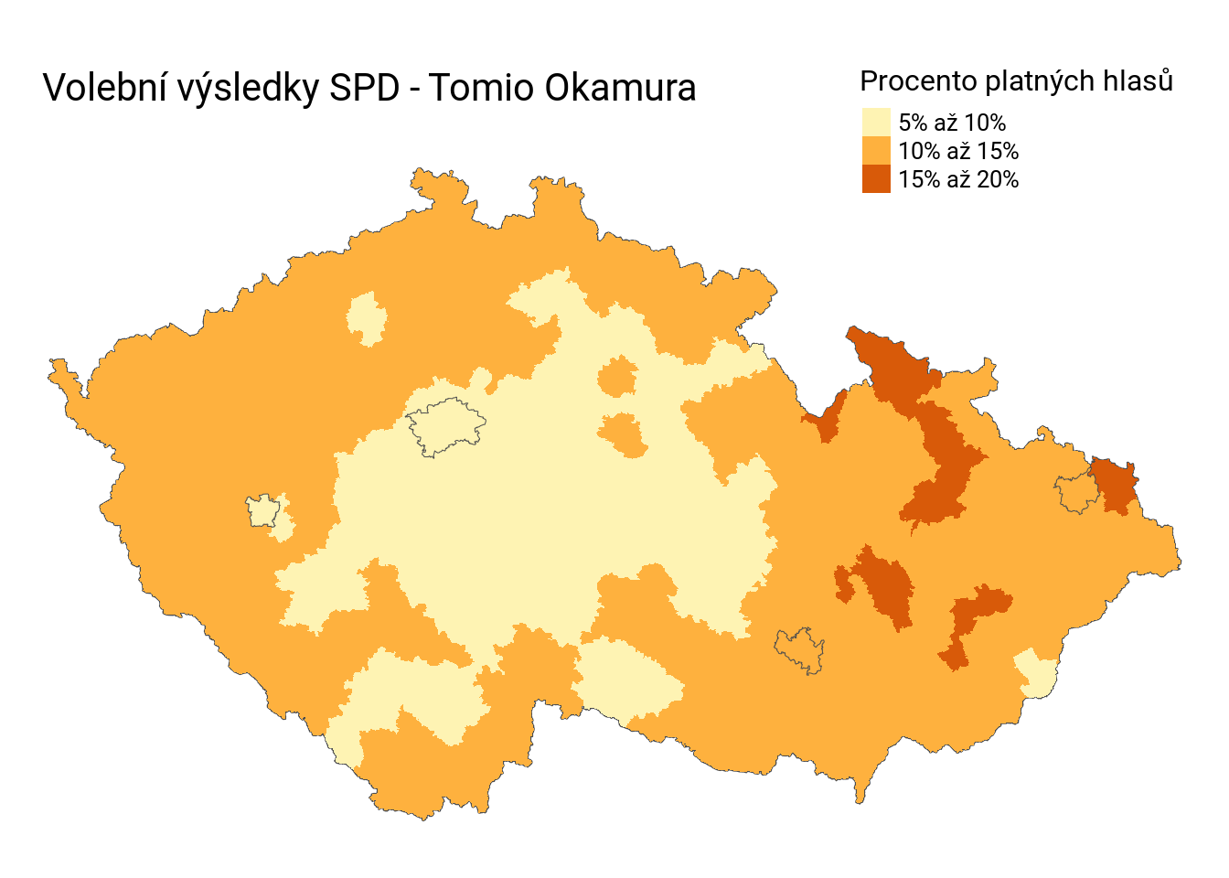 Začal jsem tím, že jsem sestavil mapu volebních výsledků SPD - Tomio Okamura. Nejnižší jednotka, ve které Statistický úřad zveřejňuje volební výsledky je obec s rozšířenou působností (tzv. trojková obec) a tak jsem mapu nakreslil podle nich.